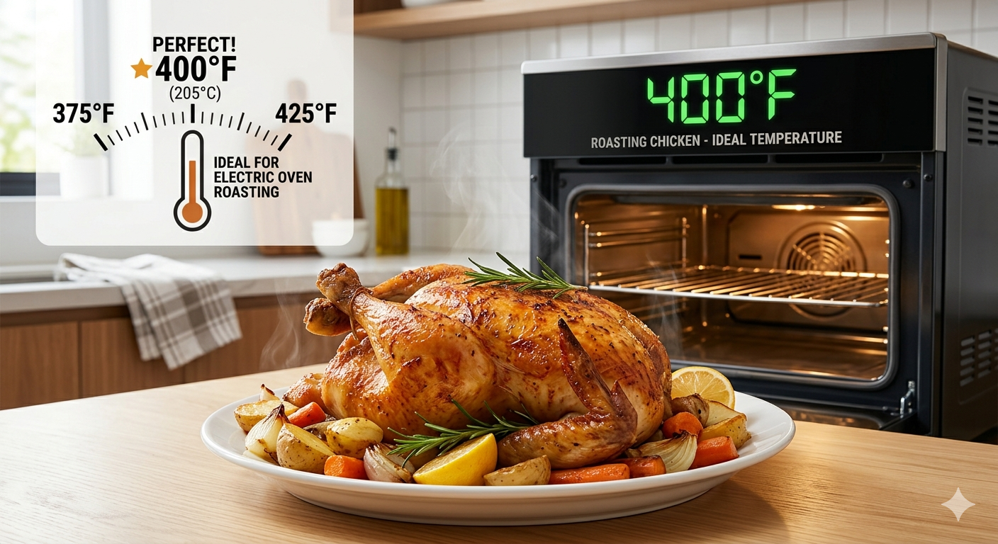 ideal elektrikli fırın tavuk kızartma sıcaklığı öyle 200°C (400°F) Çıtır deri ve nemli iç kısım arasındaki mükemmel dengeyi elde etmek için standart boyutlu bütün bir kuş için. Sıcaklıklar istenen dokuya bağlı olarak 350°F ila 450°F arasında değişebilirken, 400°F elektrikli bir ortamda tutarlı radyant ısı sağlayarak yağın göğüs etini kurutmadan verimli bir şekilde işlenmesini sağlar.