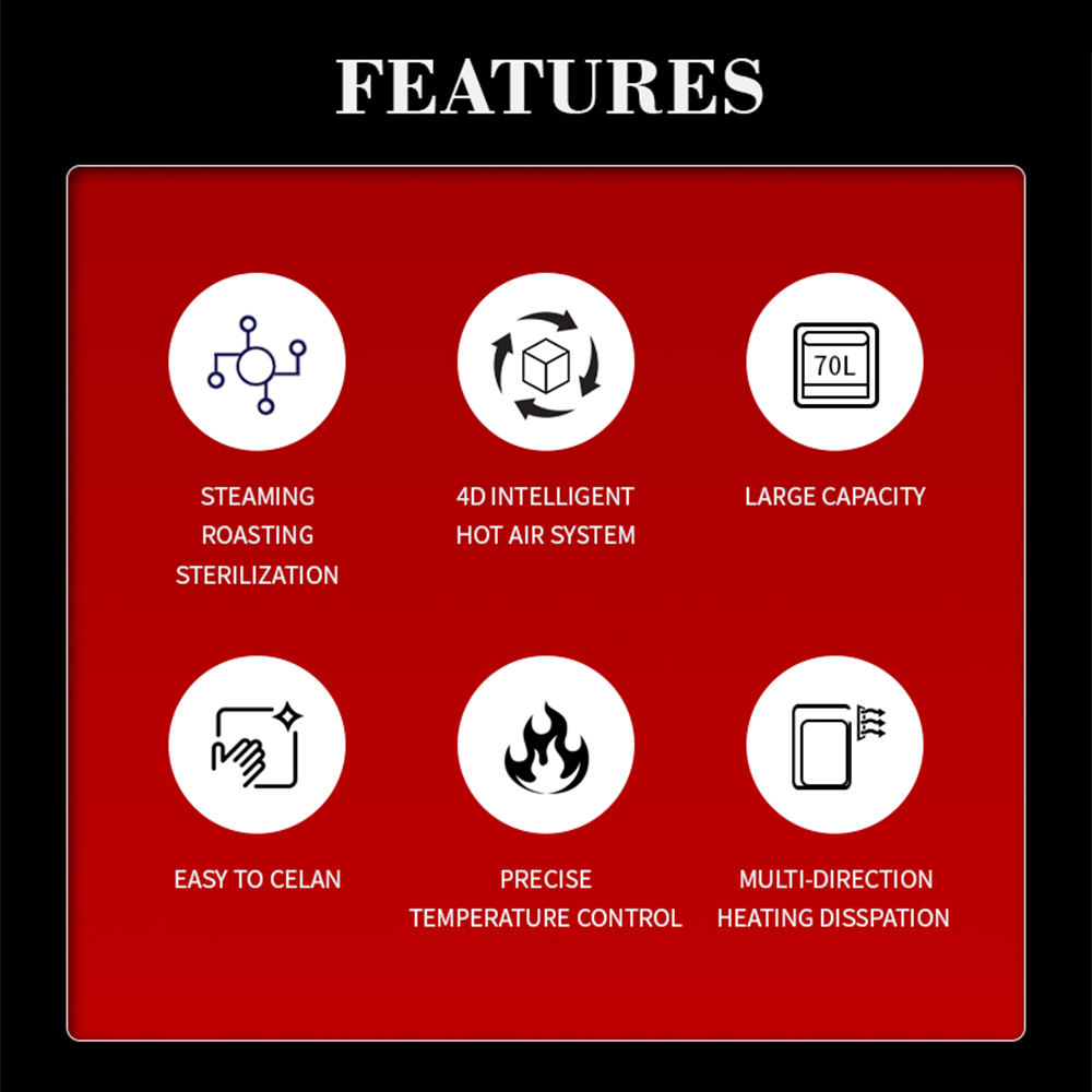 Farklı malzemeleri ve pişirme ihtiyaçlarını karşılamak için pişirme, ızgara, çözme, sıcak hava konveksiyonu vb. Gibi birden fazla pişirme modunu destekler. Bazı ürünler, tek tıklamalı pişirme yapmak için pişirme süresini ve sıcaklığı önceden belirleyebilen akıllı pişirme programlarına da sahip olabilir. Yerleşik yüksek hassasiyetli sıcaklık sensörü ve akıllı sıcaklık kontrol sistemi, pişirme sırasında sıcaklık stabilitesini ve doğruluğunu sağlar. Kullanıcılar sıcaklığı hassas pişirme için gerektiği gibi ayarlayabilir.